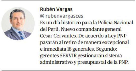 A continuación anunció el reclutamiento de gerentes civiles por intermedio de la Autoridad Nacional del Servicio Civil (Servir) para que administren los fondos públicos de la Policía Nacional destinados a las contrataciones y adquisiciones. También informó que pedirá que la Contraloría General de la República intervenga para transparentar la ejecución presupuestal.